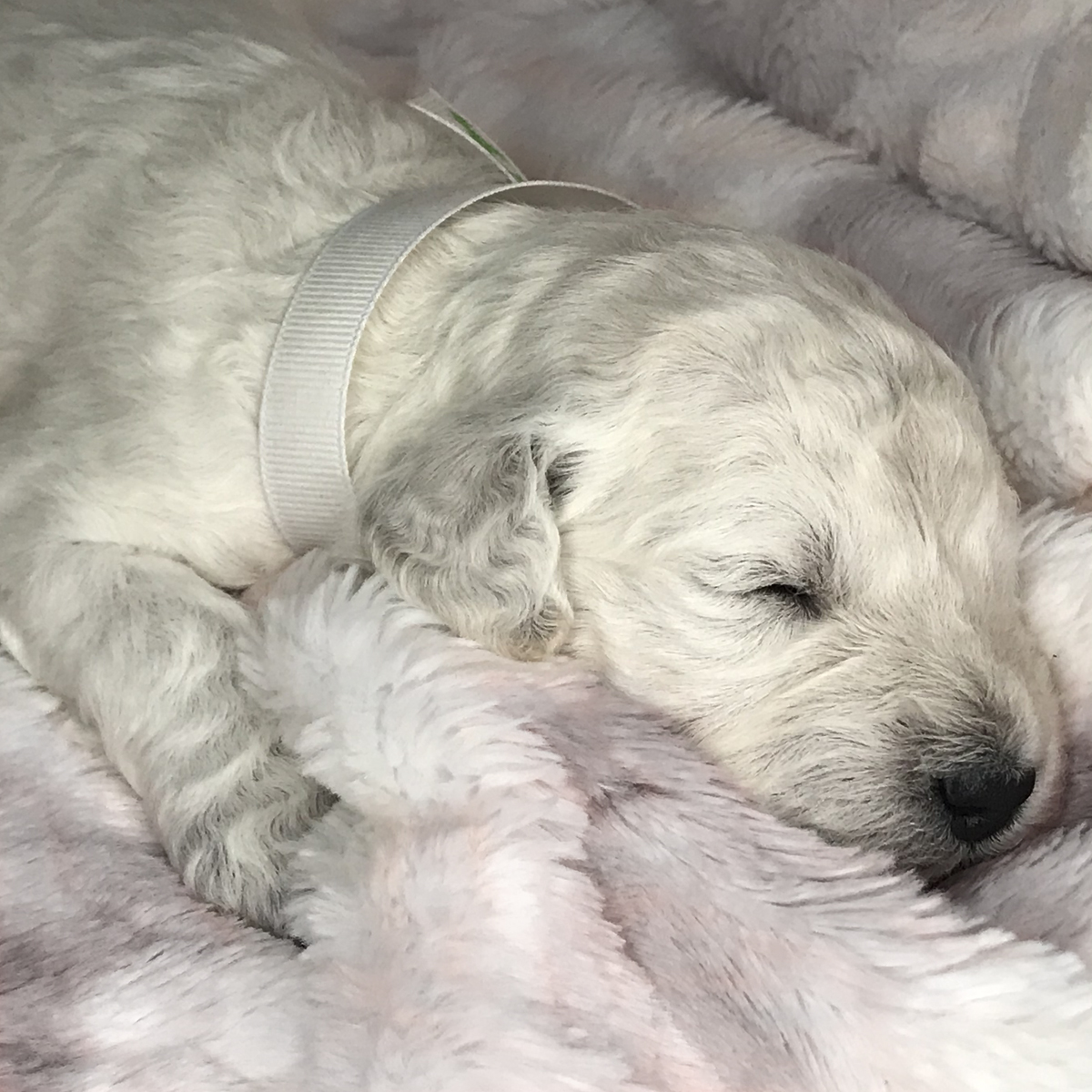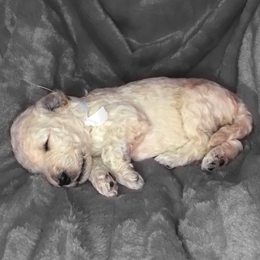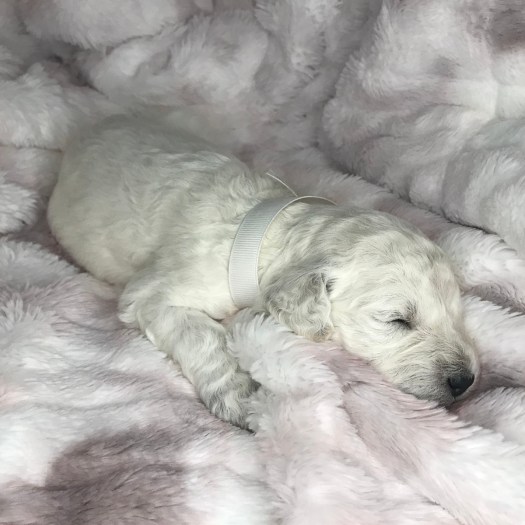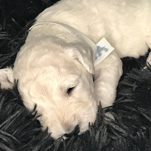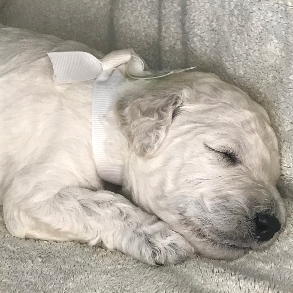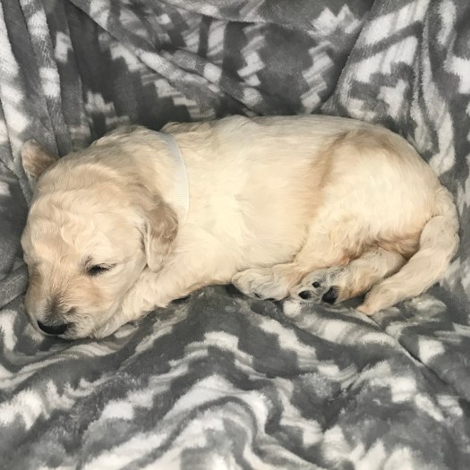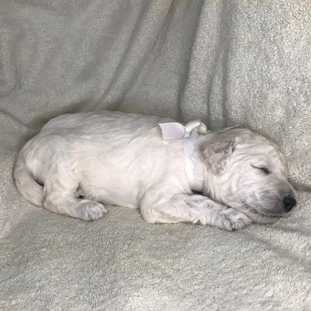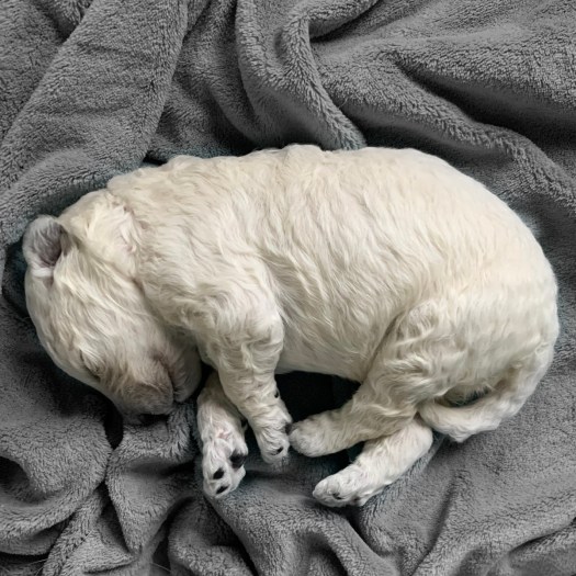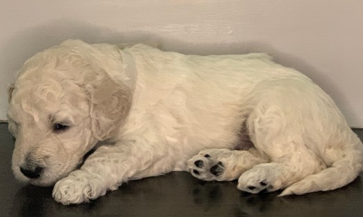 Rocket just won’t quit growing. As one of the puppies with the whitest fur, he has primarily mild curls, thus far. It must be his love of sleeping that helps him keep getting bigger.