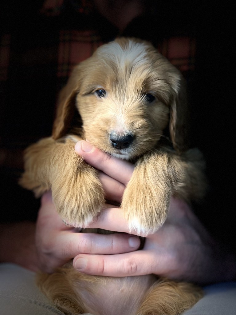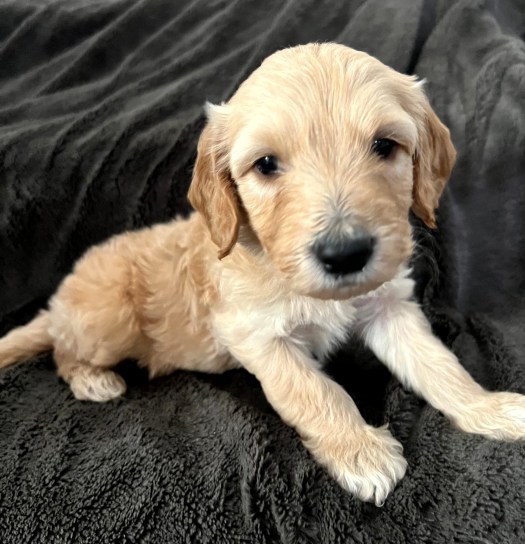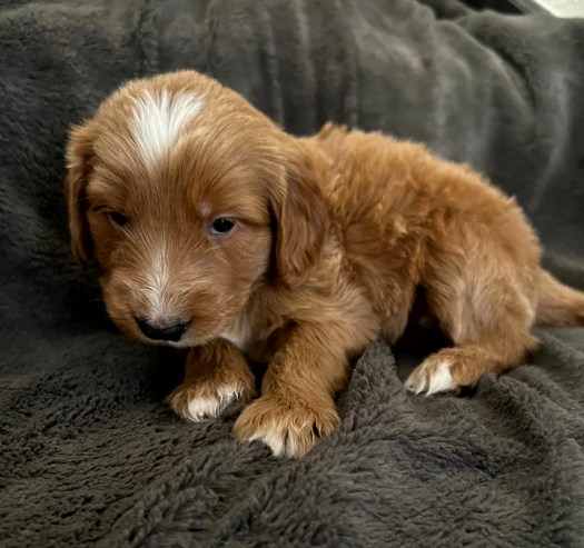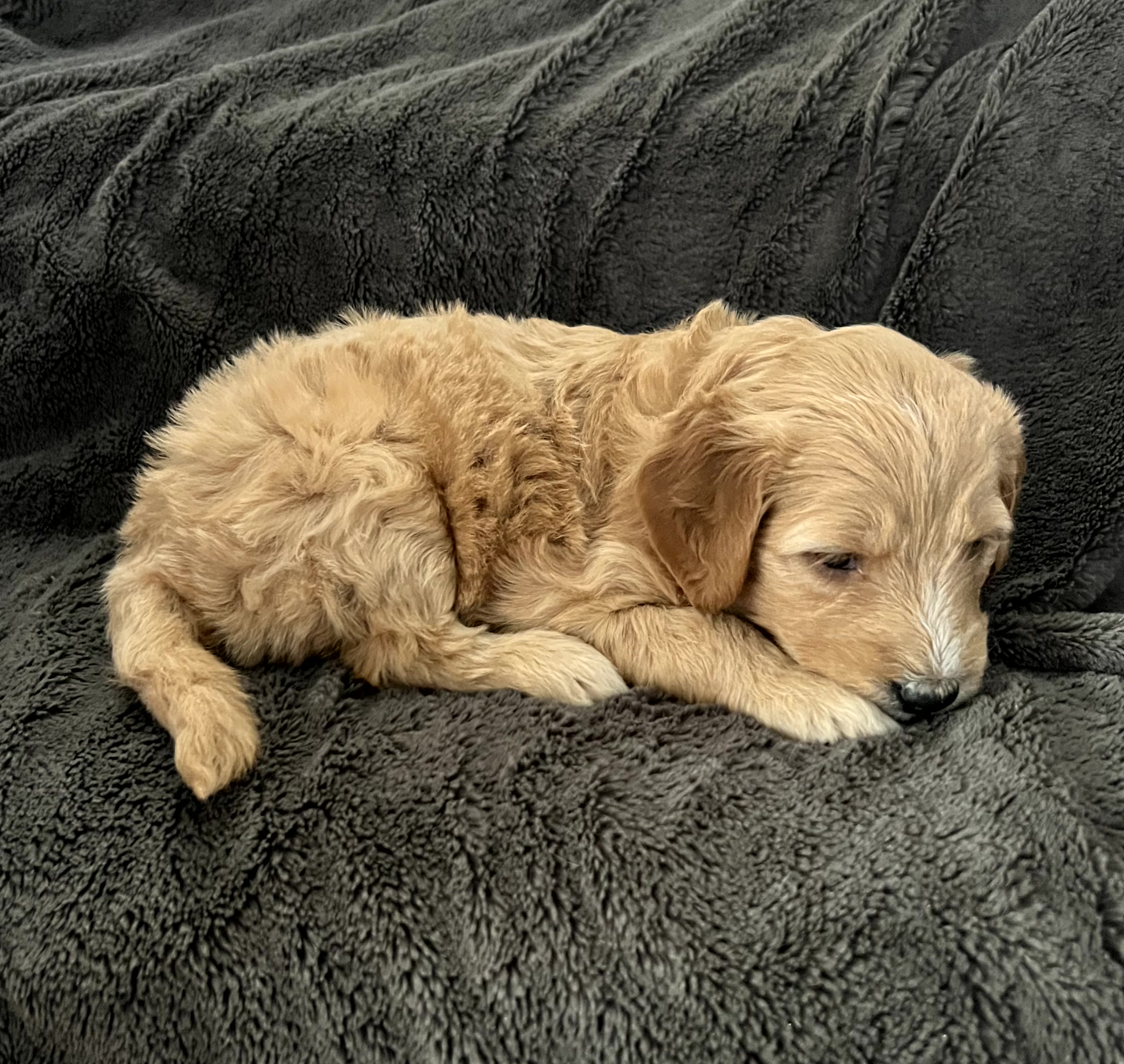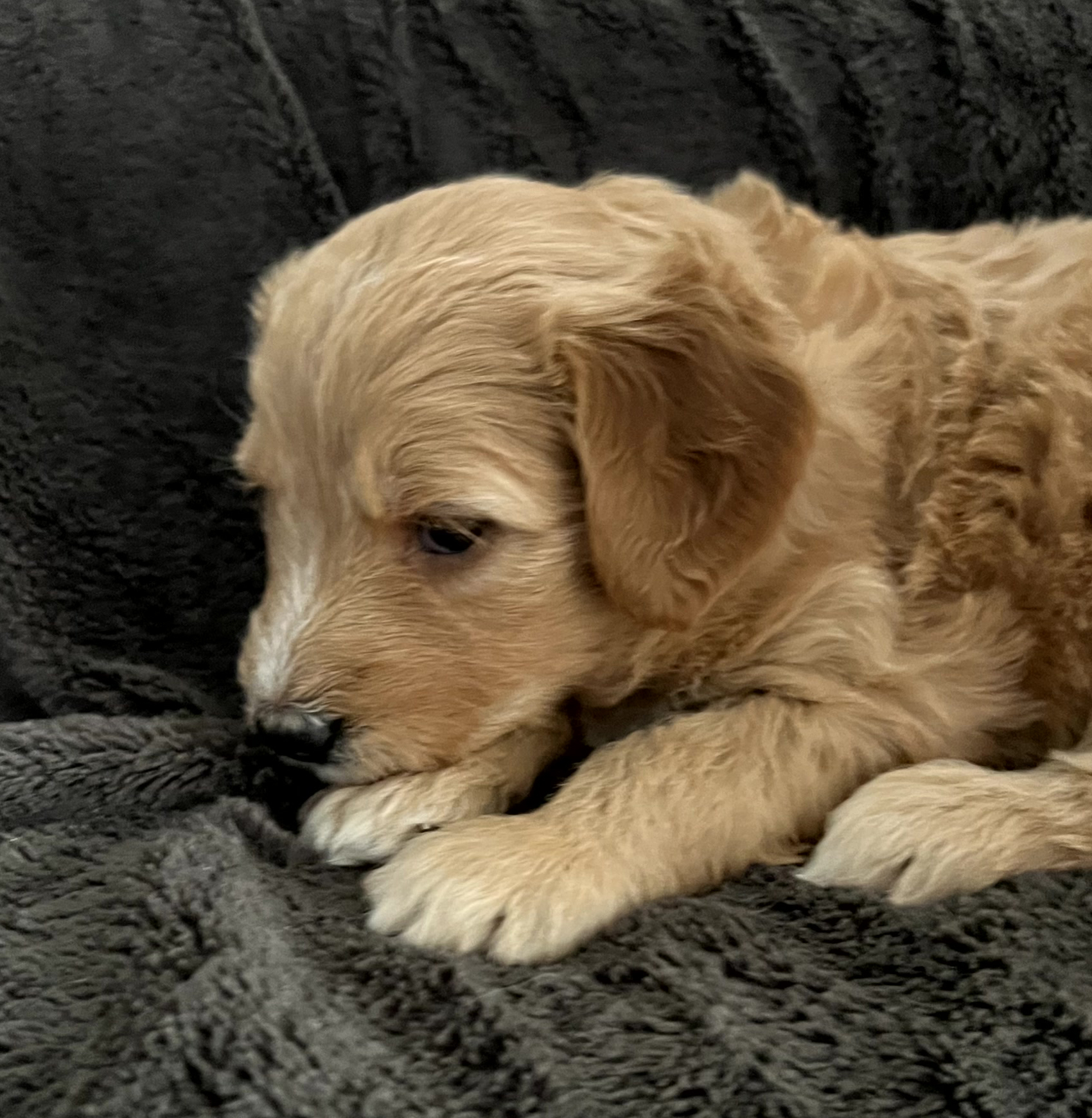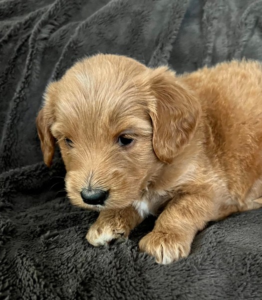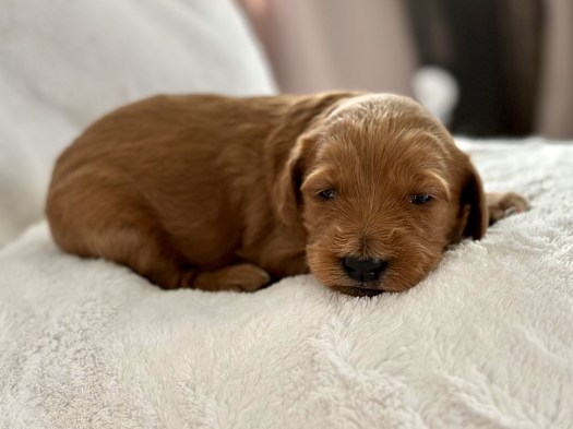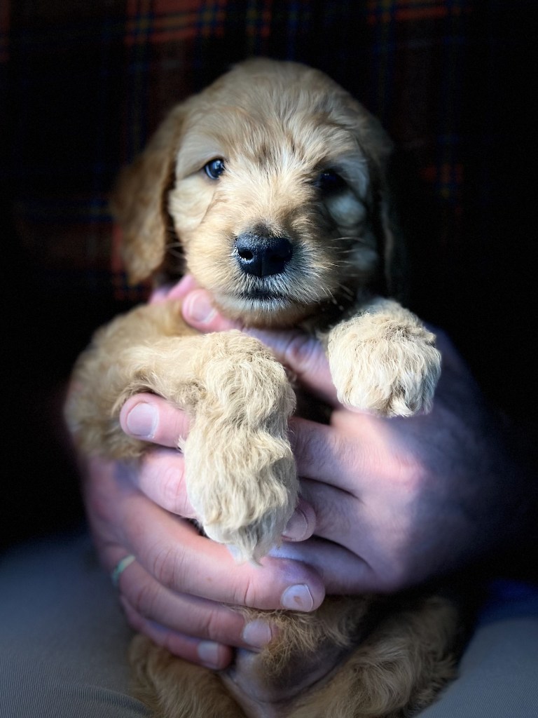 Artemis has some of the curliest golden brown fur of the bunch, so far. He’s rather chill in nature, and has been known to give some real heart-melting kisses when held close. He’s also emerged as a hearty eater, and loves actively playing with his siblings.