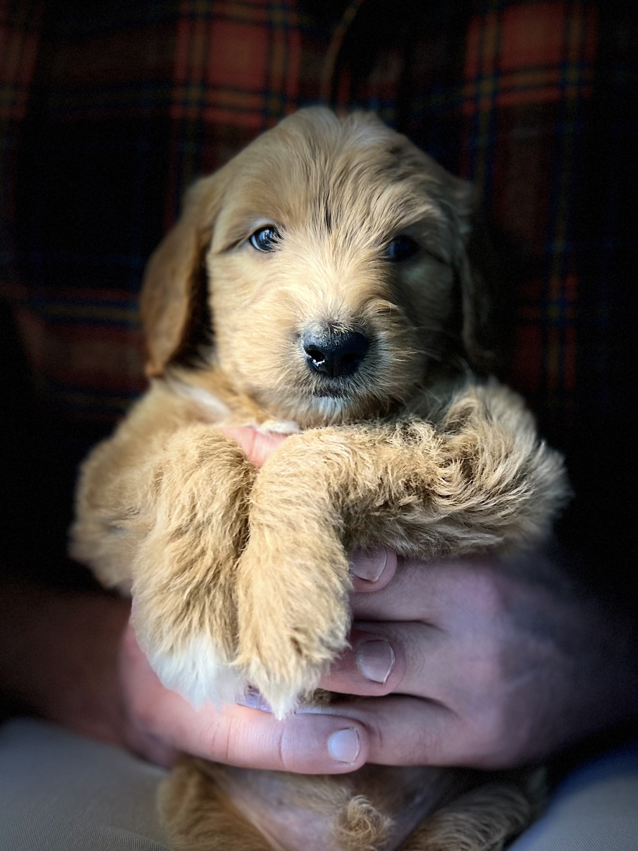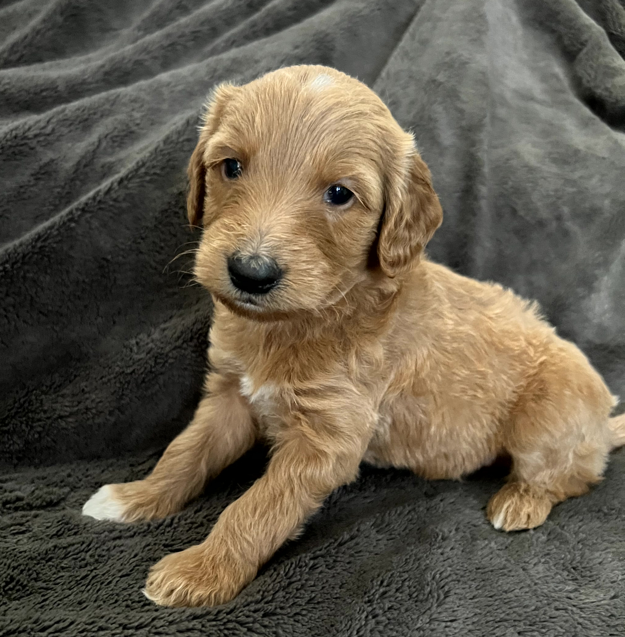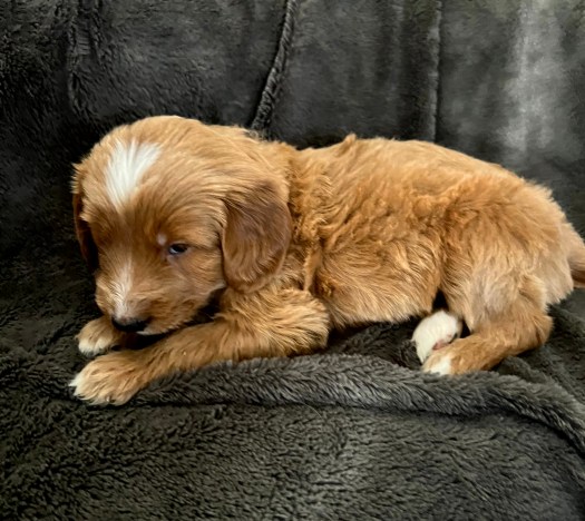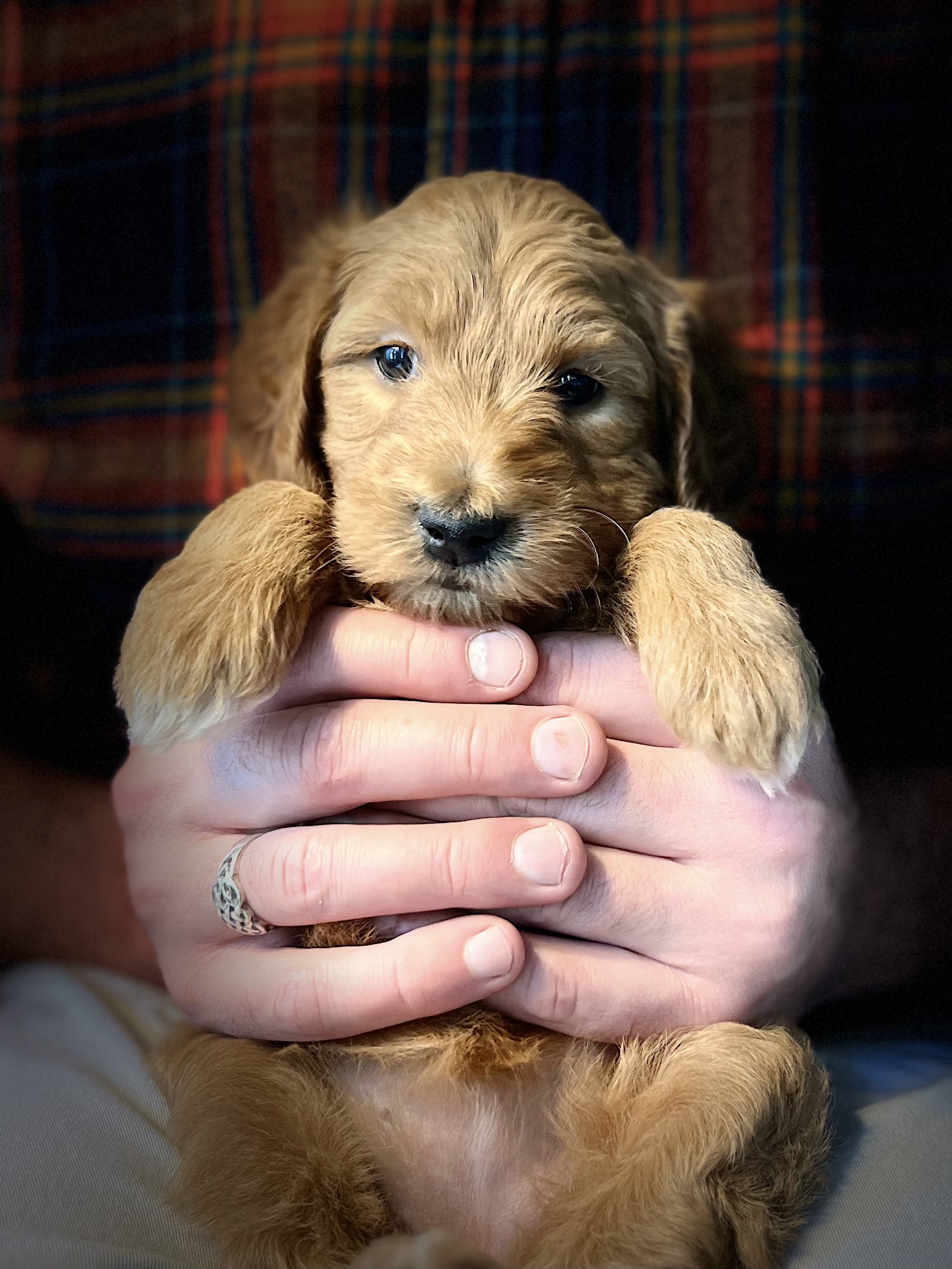 Named for a nebula (and a special someone), Eden – or “Hunbee”, as she’s often called – gets lots and lots of cuddly loves, by never hesitating to seek them out. Early on she began walking up to the sound of voices before most of her siblings. As one of the lightest colored doods in this litter, she also sports an adorable extra-light fur patch on her forehead like a guiding star.
