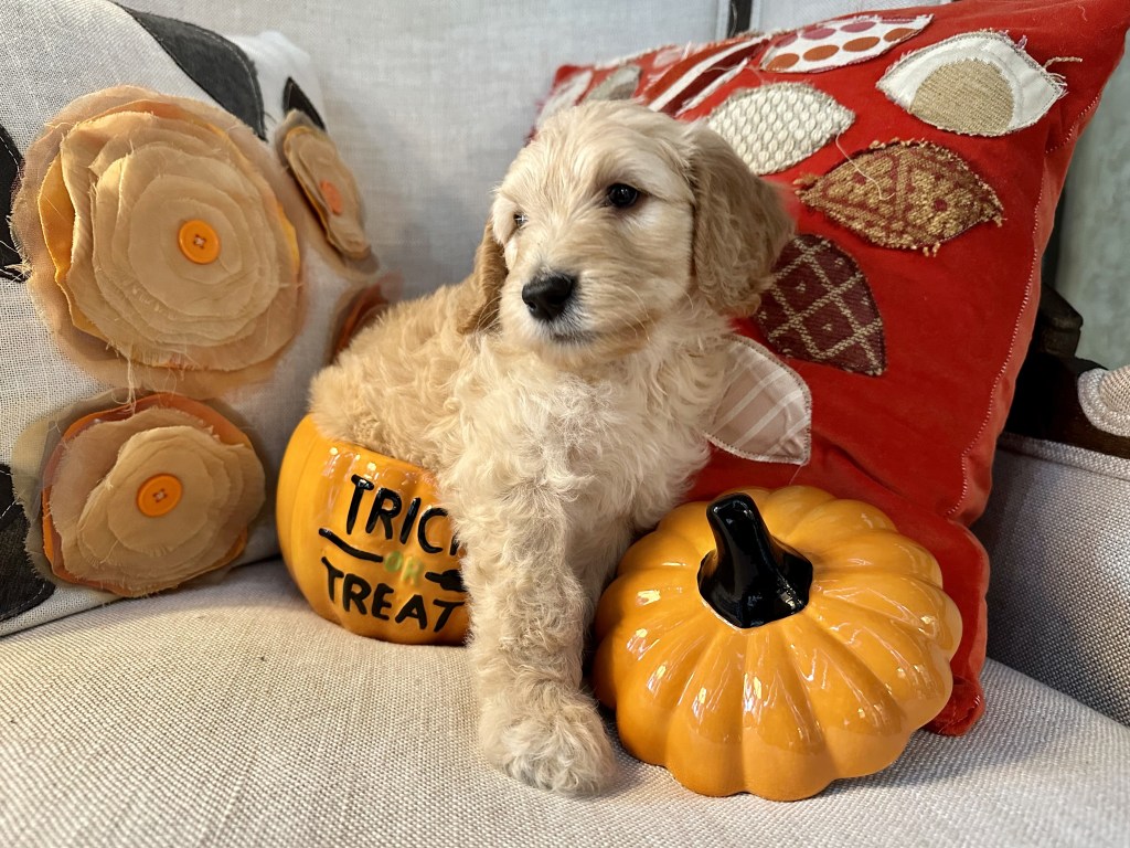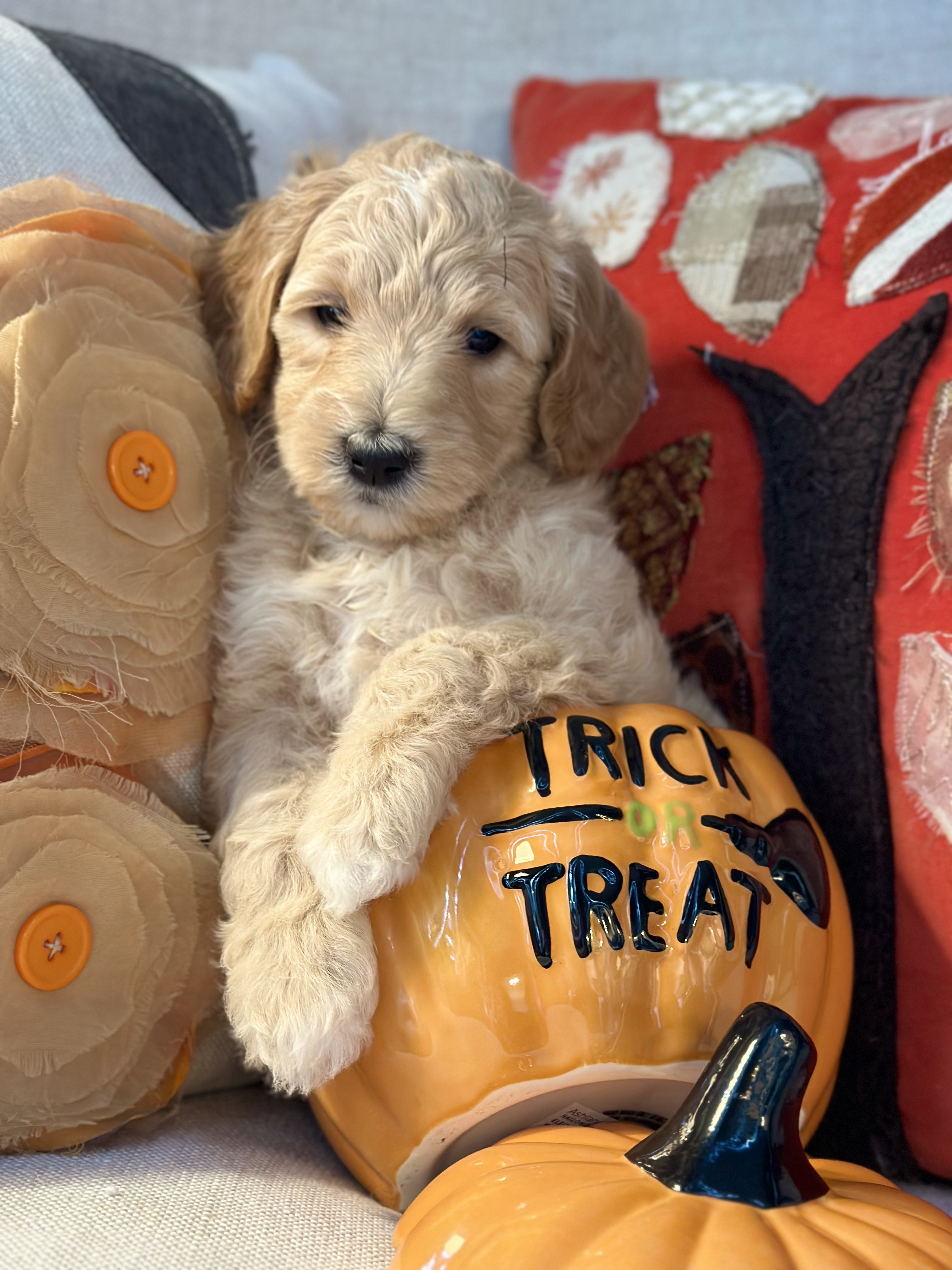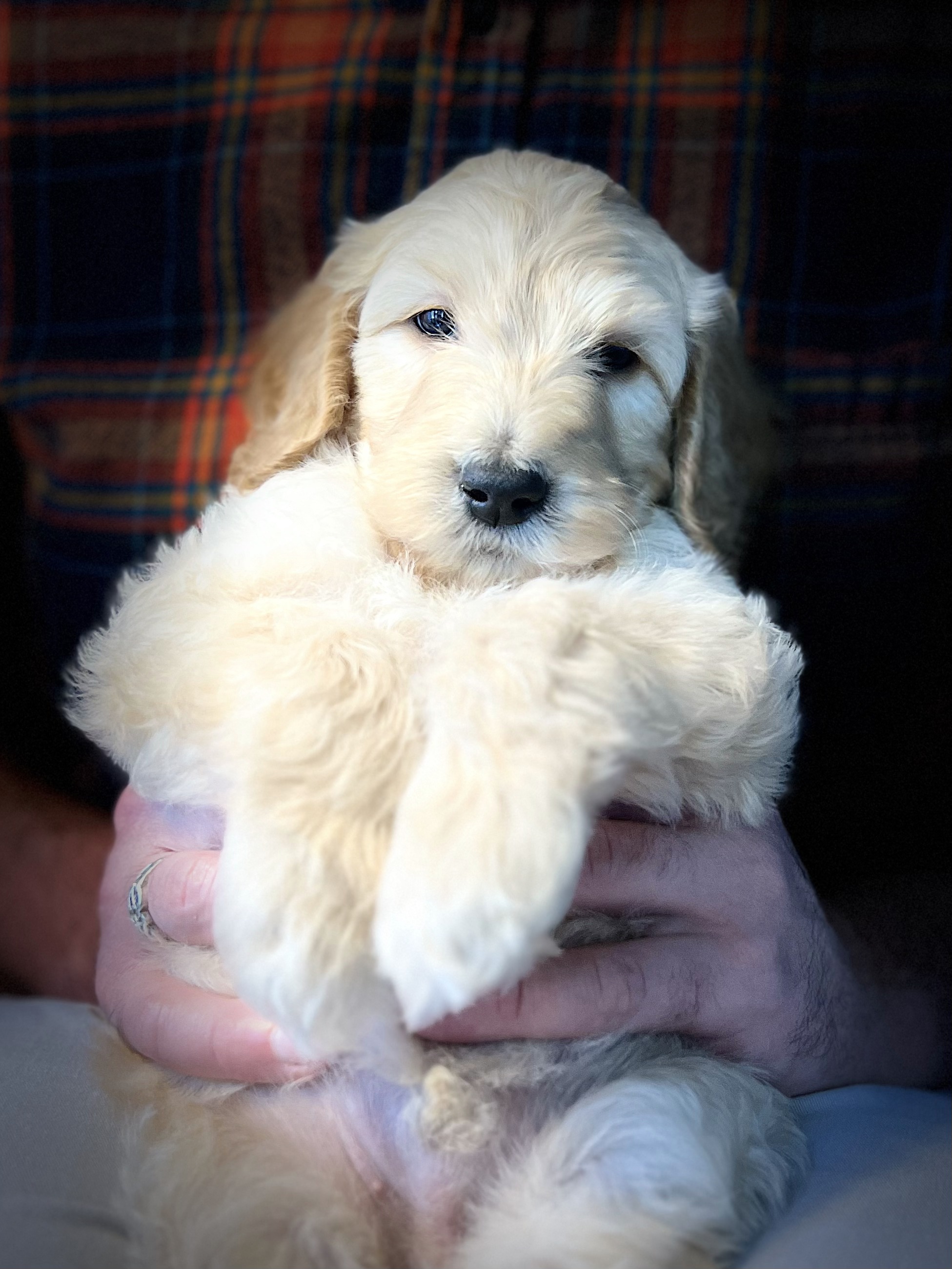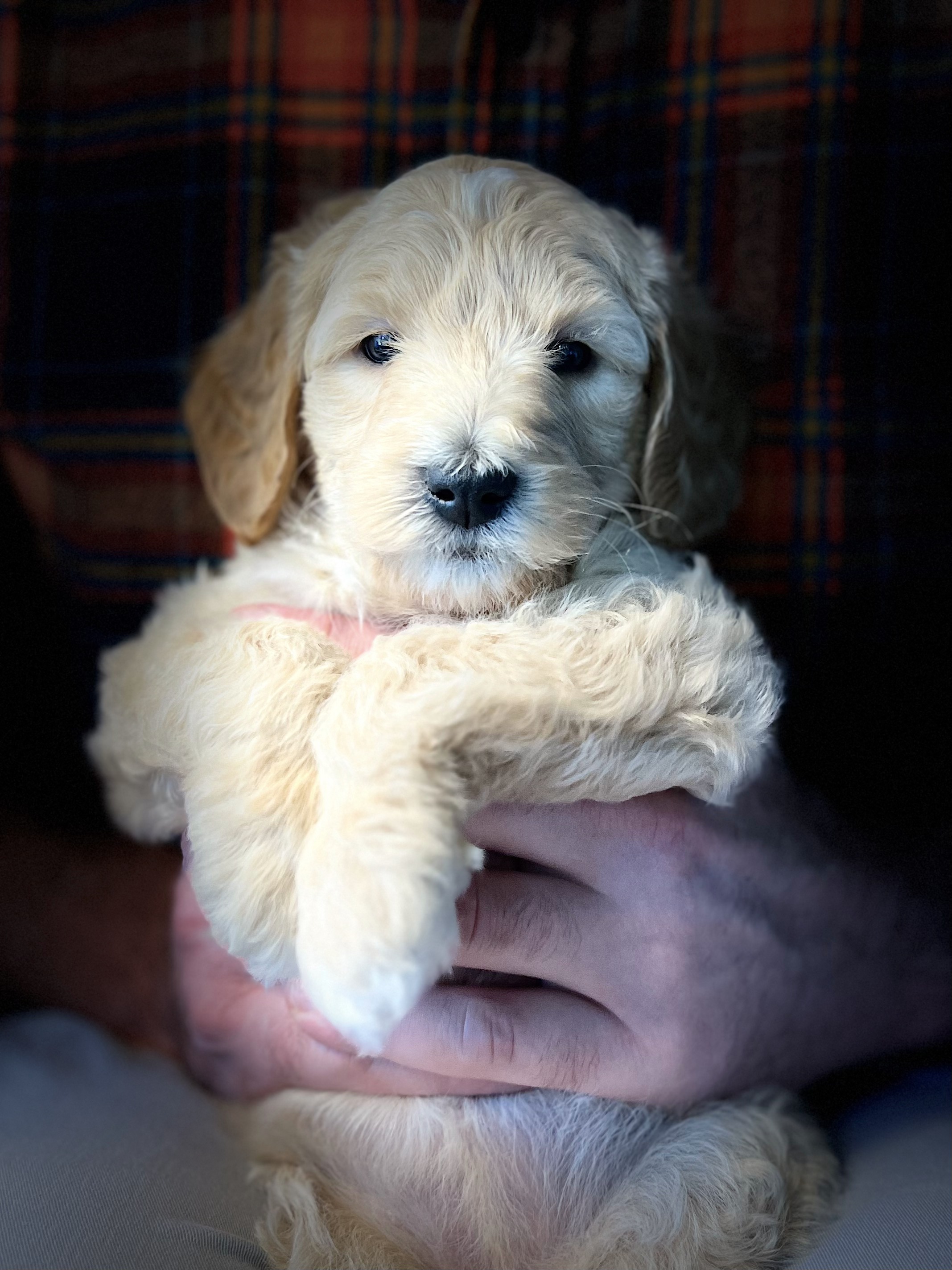 Named for a nebula (and a special someone), Eden – or “Hunbee”, as she’s often called – gets lots and lots of cuddly loves, by never hesitating to seek them out. Early on she began walking up to the sound of voices before most of her siblings. As one of the lightest colored doods in this litter, she also sports an adorable extra-light fur patch on her forehead like a guiding star.